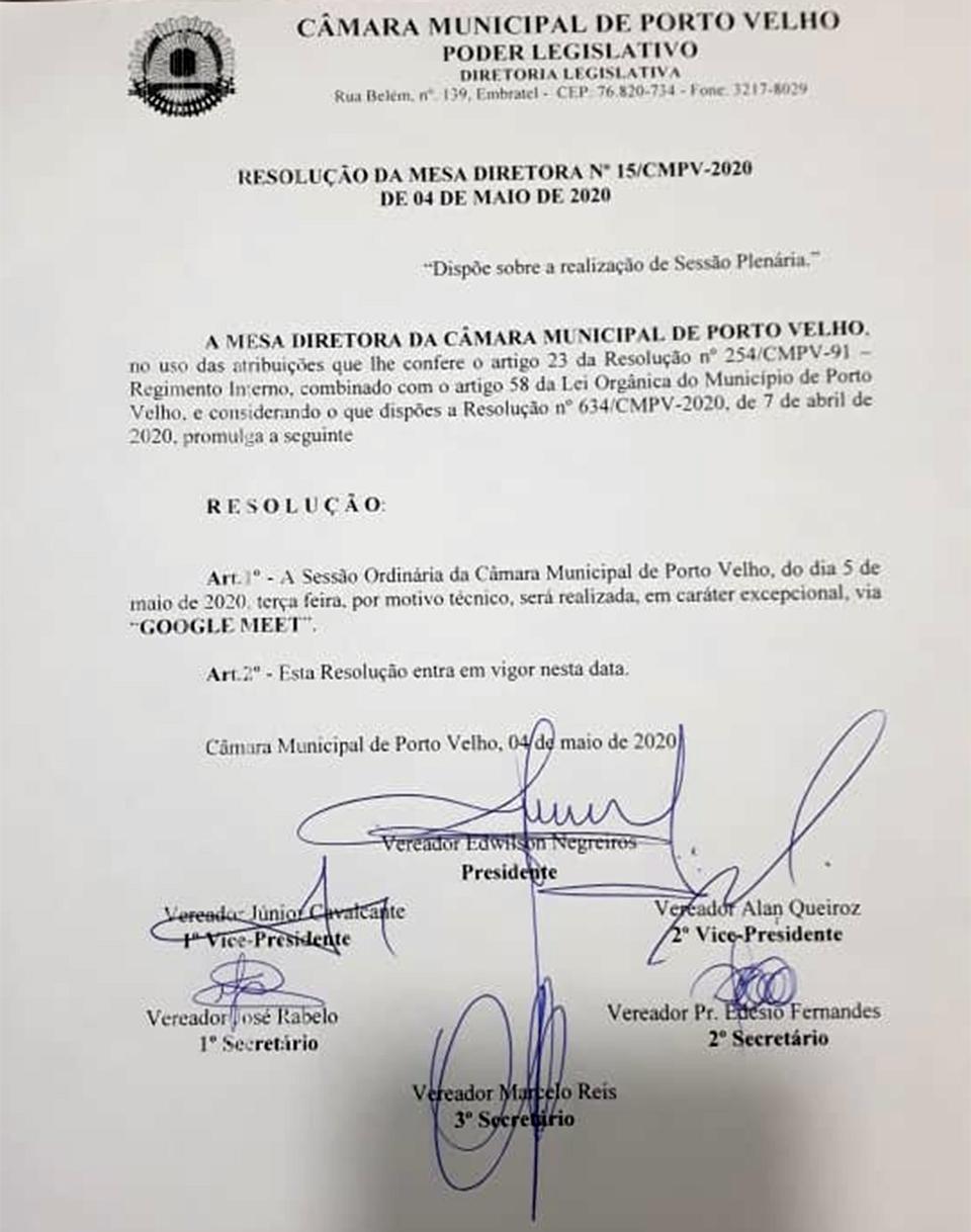 Porto Velho, RO — Encabeçada pelo presidente Edwilson Negreiros, do PSB, a Câmara de Porto Velho realizou, na última terça-feira (05), a primeira sessão virtual após a deflagração da pandemia de Coronavírus em Rondônia.