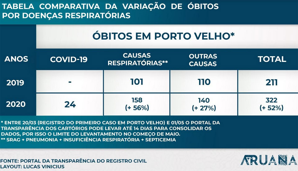 Ao baixo índice de testagem soma-se o aumento do número de óbitos em Porto Velho, cidade rondoniense com a maior quantidade de casos registrados da doença. Na capital estavam, até a metade do mês de maio, 77% dos casos de Covid-19 oficializados em Rondônia. No epicentro estadual da doença quantidade de óbitos entre os dias 20 de março e 1º de maio subiu 52% em comparação ao ano passado. Se considerados apenas as mortes causadas por doenças respiratórias, sem contar a Covid-19, o aumento no mesmo período em comparação a 2019 foi de 56%.