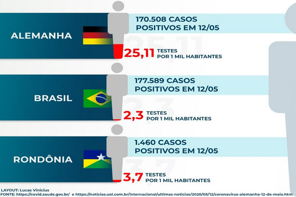 Para chegar a esta conclusão foram analisados e cruzados dados de diferentes fontes e que revelam aspectos distintos dos impactos da doença em Rondônia. O primeiro destes dados a ser considerado para ter uma visão mais ampla da situação enfrentada no Estado, é o nível de testagem da população. Ainda que Rondônia teste mais do que a média nacional – enquanto em todo o Brasil são realizados, em média, 2,3 testes a cada mil habitantes, em Rondônia são 3,7 testes para cada mil pessoas – este índice ainda é baixo para permitir ter um quadro que permita saber o comportamento da doença. A título de comparação, a Alemanha, país que começa a sair do confinamento apenas agora, testou até o final de abril 25,11 pessoas a cada mil habitantes.