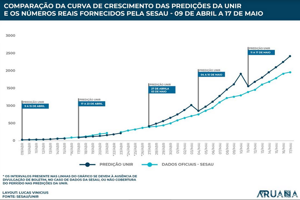 Mas, é preciso um adendo: como se trata de previsões, os números que projetam os casos para as próximas semanas e meses dependem das condições analisadas semana a semana, como a efetividade do isolamento social, por exemplo. A projeção de 375 mil casos no princípio de agosto, por exemplo leva em consideração as condições existentes em 16 de abril, ou seja, há cerca de um mês. Se de lá para cá houve menor circulação de pessoas e as condições de atendimento de saúde melhoraram, uma projeção de casos pode indicar menos infectados. Isso, no entanto, não deve fazer perder de vista o fato de que outros dados, como indicados pela checagem realizada pela equipe de Aruana, indicam com clareza para uma grande subnotificação de casos em Rondônia.