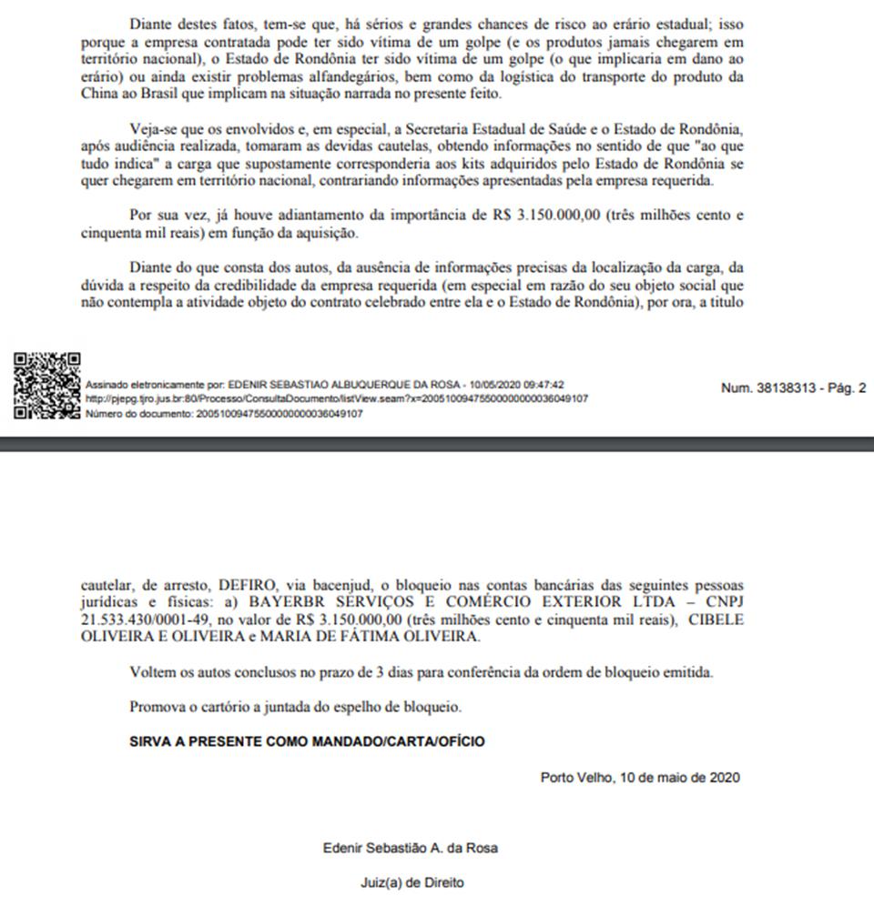 Juiz falou em "golpe" quando bloqueou os valores, antes de os teste chegarem / Reprodução-Decisão judicial