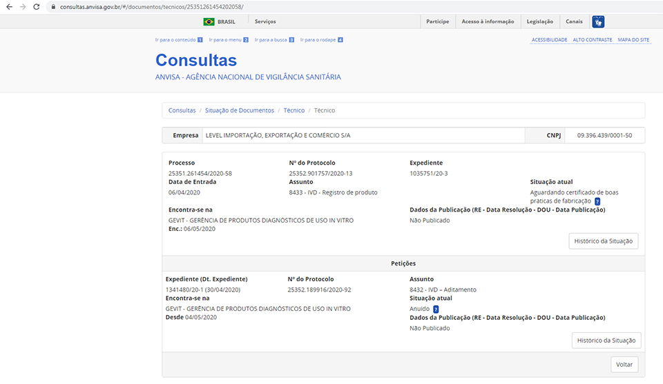 Até a manhã desta quinta-feira (21), o status no sistema da Agência Nacional de Vigilância Sanitária (Anvisa) para as amostras do teste chinês fabricado pela empresa Hangzhou Realy Tech Co., Ltd. no negócio intermediado com o Governo de Rondônia pela BuyerBR em parceria com a Level Importação era: "Aguardando certificado de boas práticas de fabricação ".