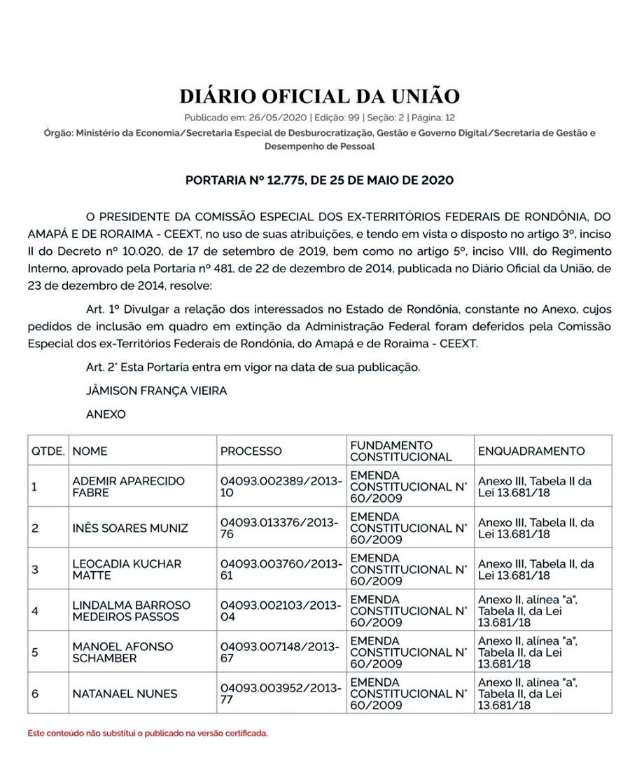 O Diário Oficial da União publicou nesta terça-feira (26/05), a Portaria nº 12.775, beneficiando 6 servidores de Rondônia com a Transposição. Esses servidores passarão a receber pela folha federal, após enquadramento.