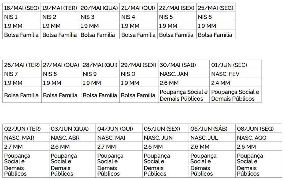 O calendário publicado hoje (15) vale para as pessoas que receberam a primeira parcela até o dia de 30 de abril de 2020. Na tarde desta sexta-feira, está prevista entrevista coletiva, no Palácio do Planalto, para detalhar como será o pagamento.