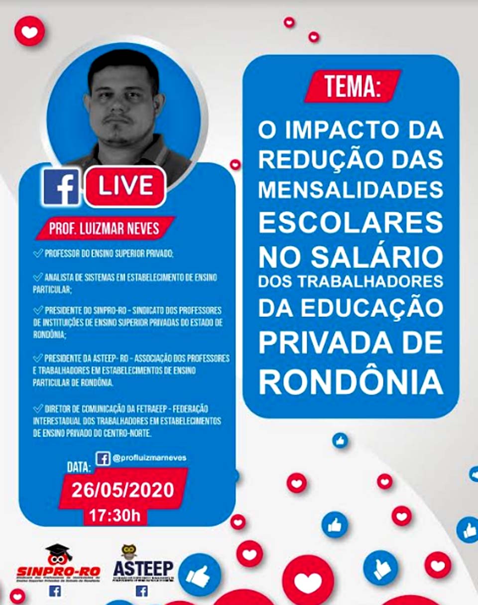 Uma live, apresentada pelo Professor Luizmar Neves, irá explicar o impacto que a redução das mensalidades escolares pode ocasionar nos salários e contratos de trabalho dos trabalhadores em Educação Particular de Rondônia.