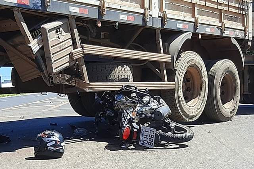 No impacto, o motociclista ficou embaixo da carreta e sofreu graves ferimentos pelo corpo.