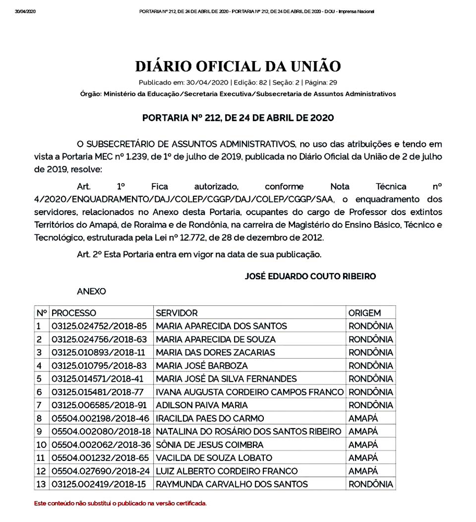 O Diário Oficial da União divulgou nesta quinta-feira (30/04), nova Portaria enquadrando professores de Rondônia na Carreira de Magistério do Ensino Básico Técnico e Tecnológico (EBTT).