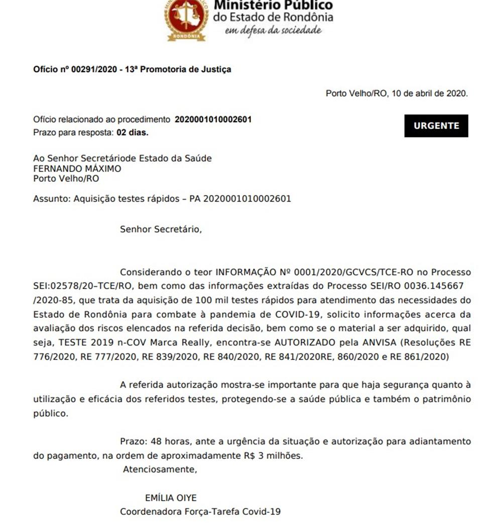 No dia 10 de abril, a promotora Emília Oiye, coordenadora da Força-Tarefa Covid-19 instituída pelo MP rondoniense, encaminhou ofício, com urgência, solicitando explicação sobre essa liberação.