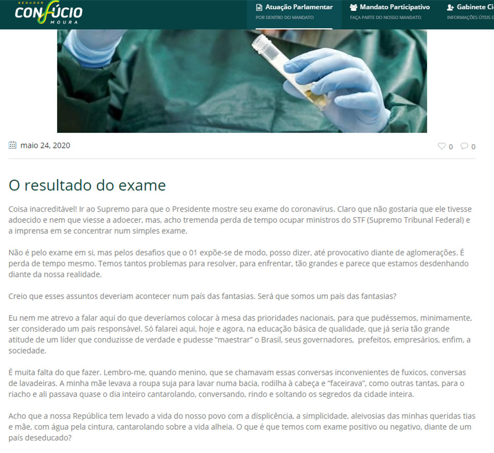 Porto Velho, RO – O senador Confúcio Moura, do MDB, falou sobre a questão do exame de Coronavírus apresentado pelo presidente Jair Bolsonaro após ação no Supremo Tribunal Federal (STF).