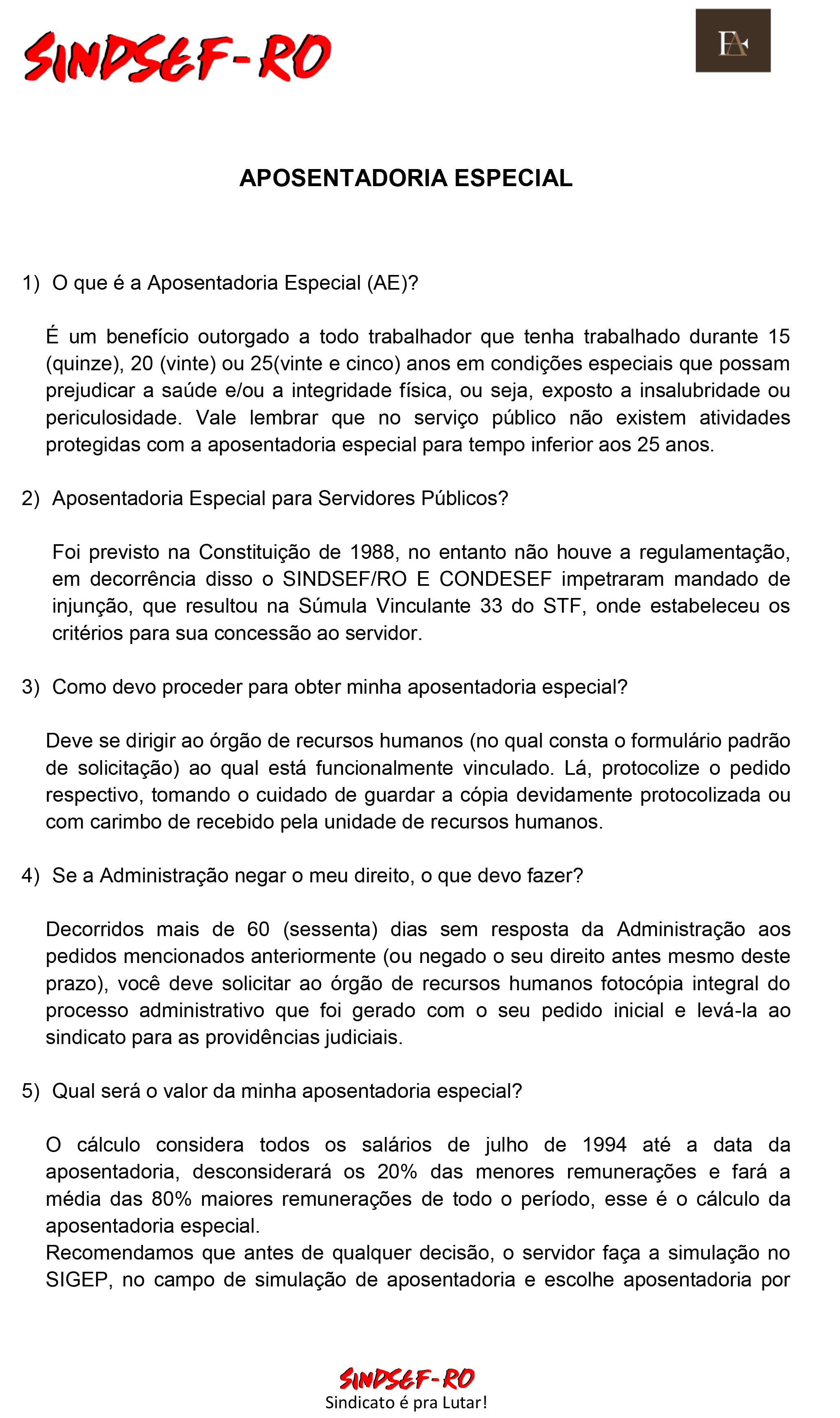 Para melhor entendimento sobre o aposentadoria especial, o Sindsef e a Escritório de Advocacia Fonseca & Assis elaboraram uma cartilha com perguntas e resposta sobre o tema: