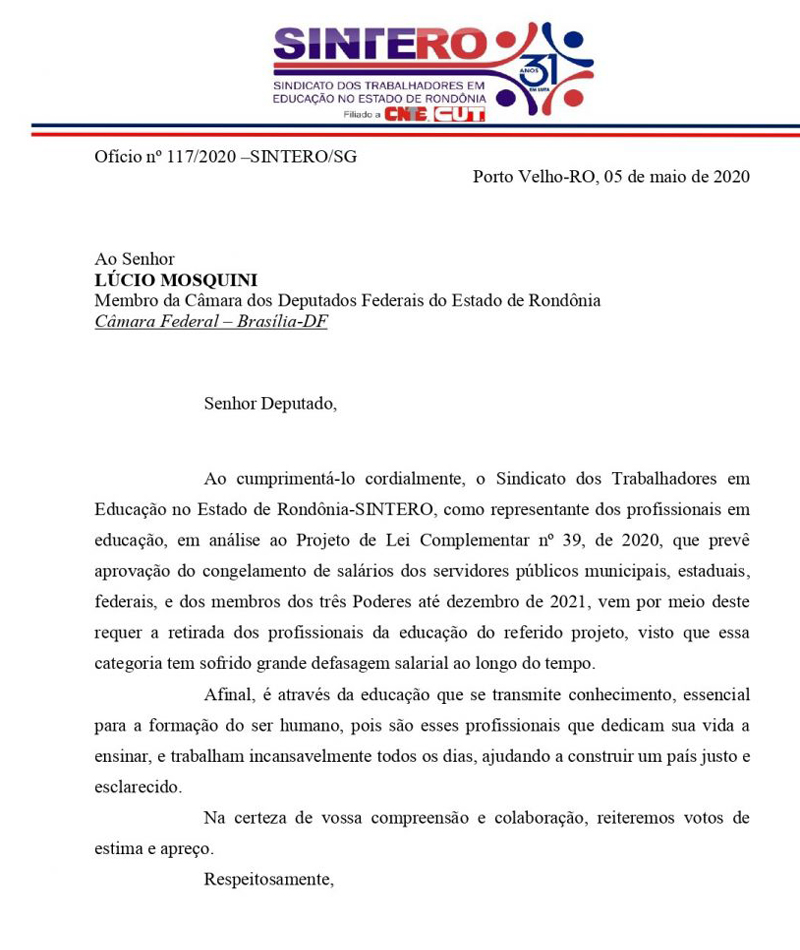A presidente do Sintero, Lionilda Simão, destaca que já entrou em contato com alguns dos membros da bancada federal, pedindo apoio e comprometimento para que os trabalhadores em educação não sofram ainda mais com essa situação, visto que é injustificável que esses servidores sejam responsabilizados e penalizados durante o período de crise, no qual habitualmente já estão sofrendo com a desvalorização salarial. O Sintero pede ainda que a categoria também participe da articulação com os deputados federais, pressionando-os por meio das redes sociais.