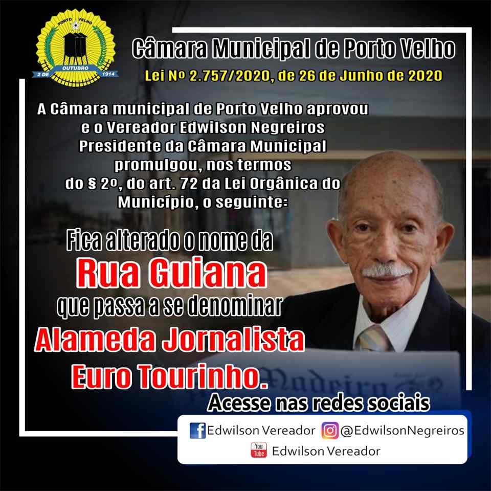O grupo sugeriu que Negreiros apresentasse à apreciação dos demais vereadores Projeto de Lei com a intenção de trocar o nome da Rua Guiana, em Porto Velho, no Bairro Embratel, para Alameda Jornalista Euro Tourinho.