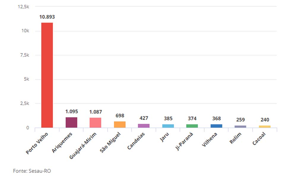 Segundo o último boletim divulgado pela Sesau, na noite da última quarta-feira (24), Porto Velho é a cidade com maior número de infectados: são quase 11 mil confirmações da doença na capital, o que corresponde a 62% do total registrado no estado.