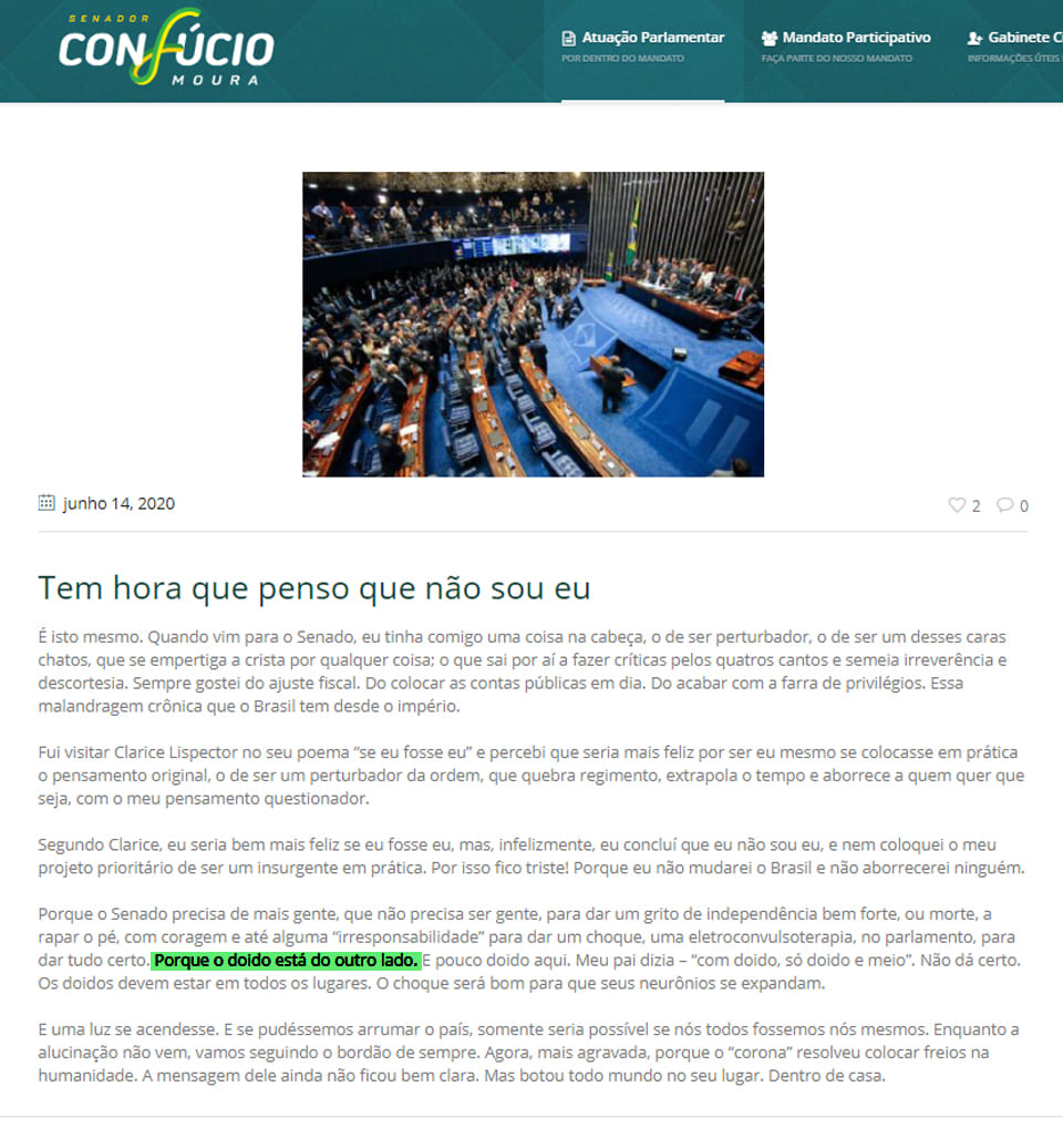 Porto Velho, RO – Em mais uma de suas postagens subliminares, ao maior estilo “em cima do muro”, o senador de Rondônia Confúcio Moura, do MDB, ex-governador do Estado, apresentou suposta crítica ao presidente da República Jair Bolsonaro.
