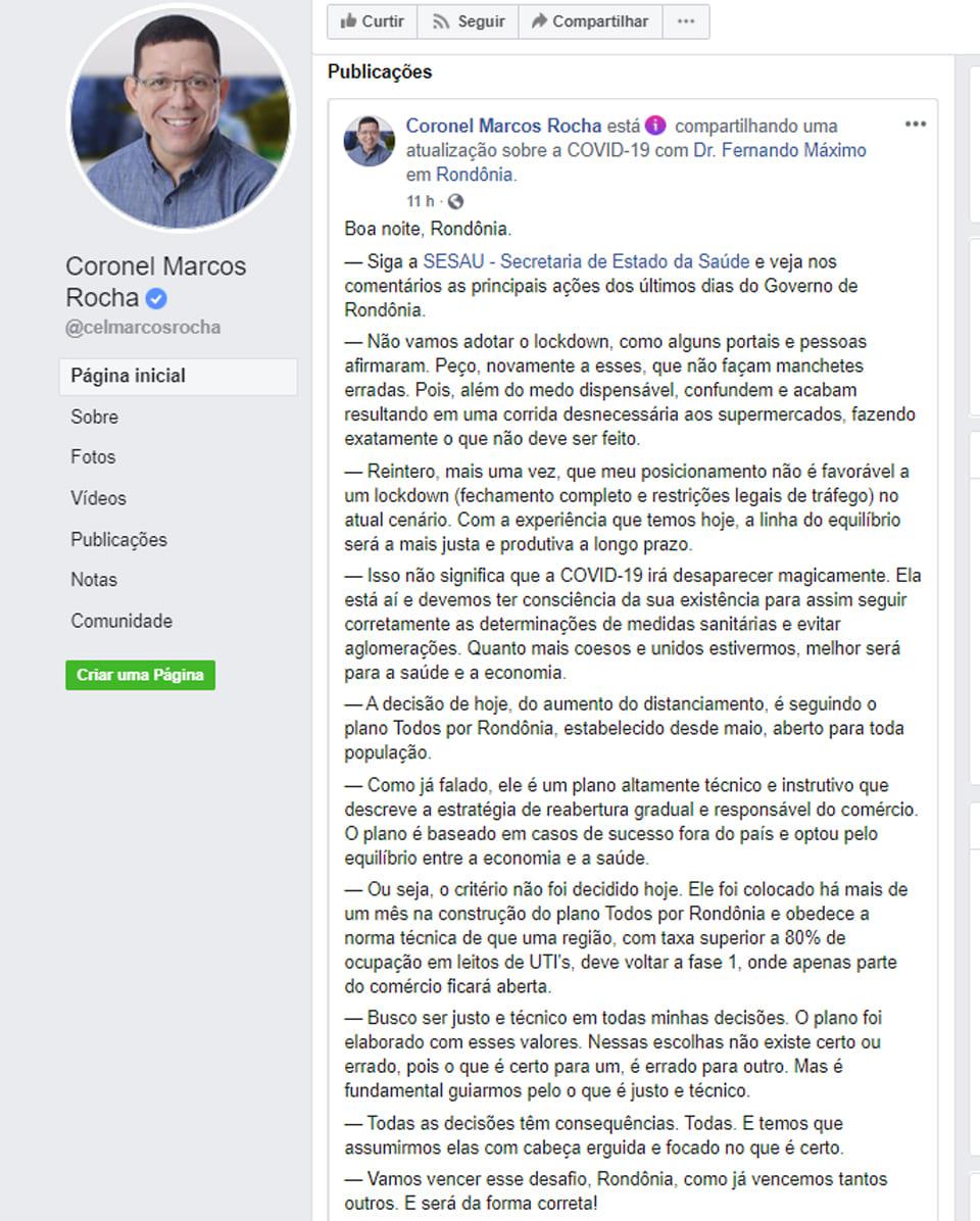 Porto Velho, RO – Em postagem com erro de português, o governador Coronel Marcos Rocha, sem partido, destacou que seu posicionamento não é favorável ao lockdown.
