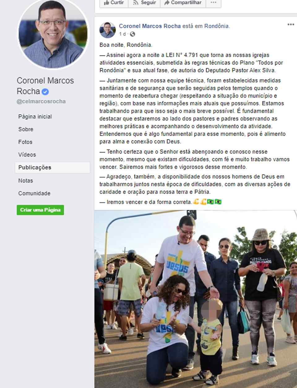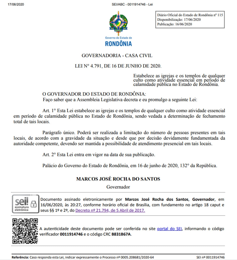 Porto Velho, RO – O governador de Rondônia Coronel Marcos Rocha, sem partido, usou sua página no Facebook a fim de anunciar: a partir de agora, igrejas são consideradas “atividades essenciais” durante a pandemia do novo Coronavírus.