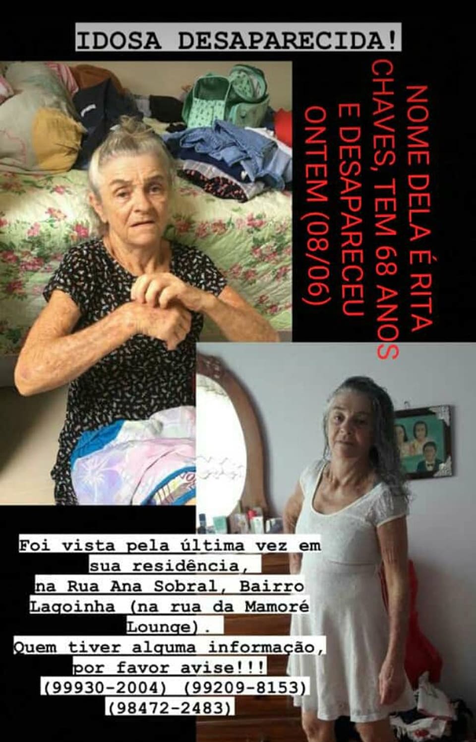 A família de Rita Chaves, 68 anos, procura pela idosa desde ontem (08), quando desapareceu. Ela foi vista pela última vez no Bairro Lagoinha, onde vive na Capital.
