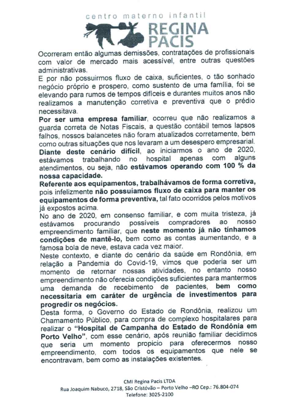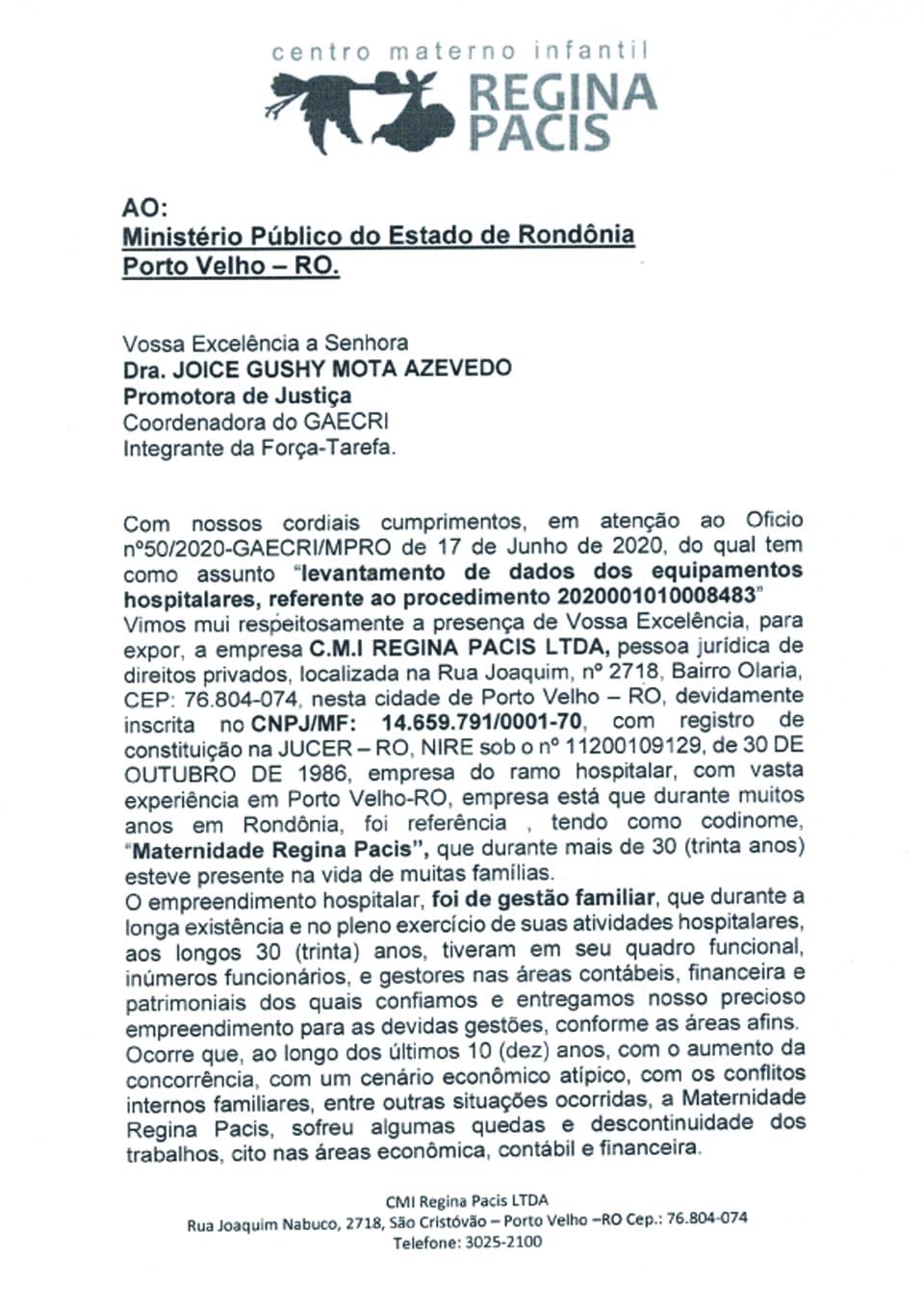 O Rondônia Dinâmica veiculou de maneira exclusiva que o órgão pediu informações à sócia-administradora do nosocômio, especialmente a respeito de valores relacionados aos equipamentos adquiridos pela gestão Marcos Rocha, sem partido, junto com a instalação predial.