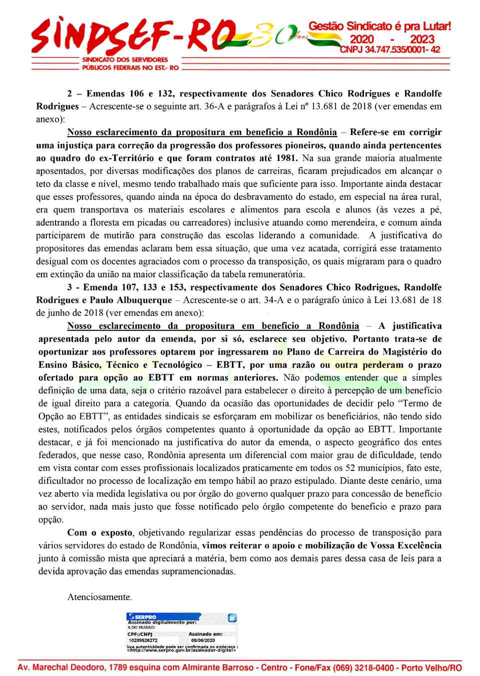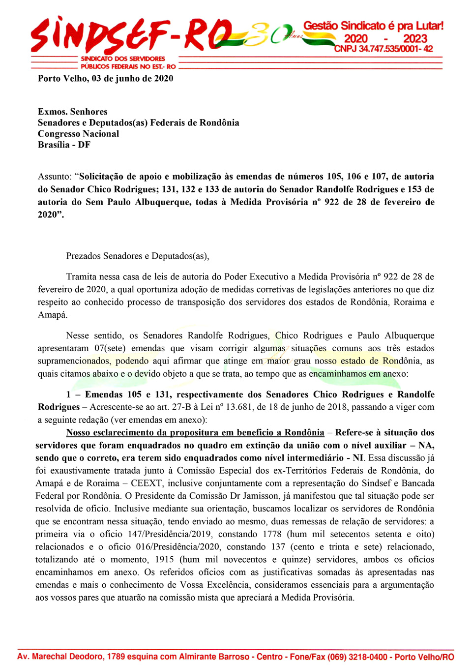Confira o Ofício enviado para os Senadores e Deputados(as) de Rondônia reiterando apoio a MP 922: