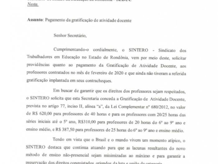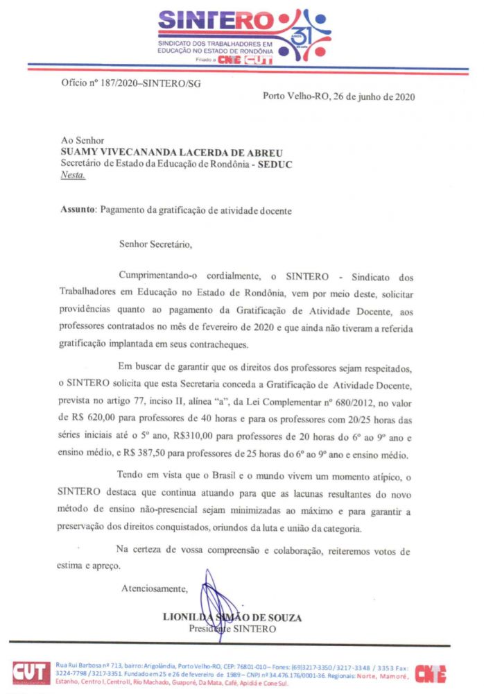O Sintero encaminhou o ofício nº 187/2020, ao Secretário de Estado da Educação, Suamy Vivecananda Lacerda de Abreu, pedindo providências quanto ao não pagamento da gratificação de atividade docente aos professores contratados a partir de fevereiro de 2020 e aos professores que estavam lotados em outras funções, mas que retornaram ao cargo de origem, assumindo as salas de aulas.
