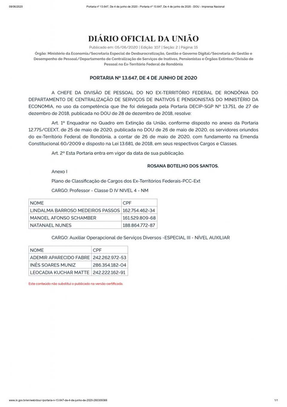Mais seis servidores de Rondônia tiveram garantidos o direito de serem enquadrados no quadro extinto da União, a conhecida transposição. Na Portaria Nº 13.647, de 4 de Junho de 2020, divulgada na Diário Oficial da União, consta o nome de seis servidores aptos aos enquadramento; confira: