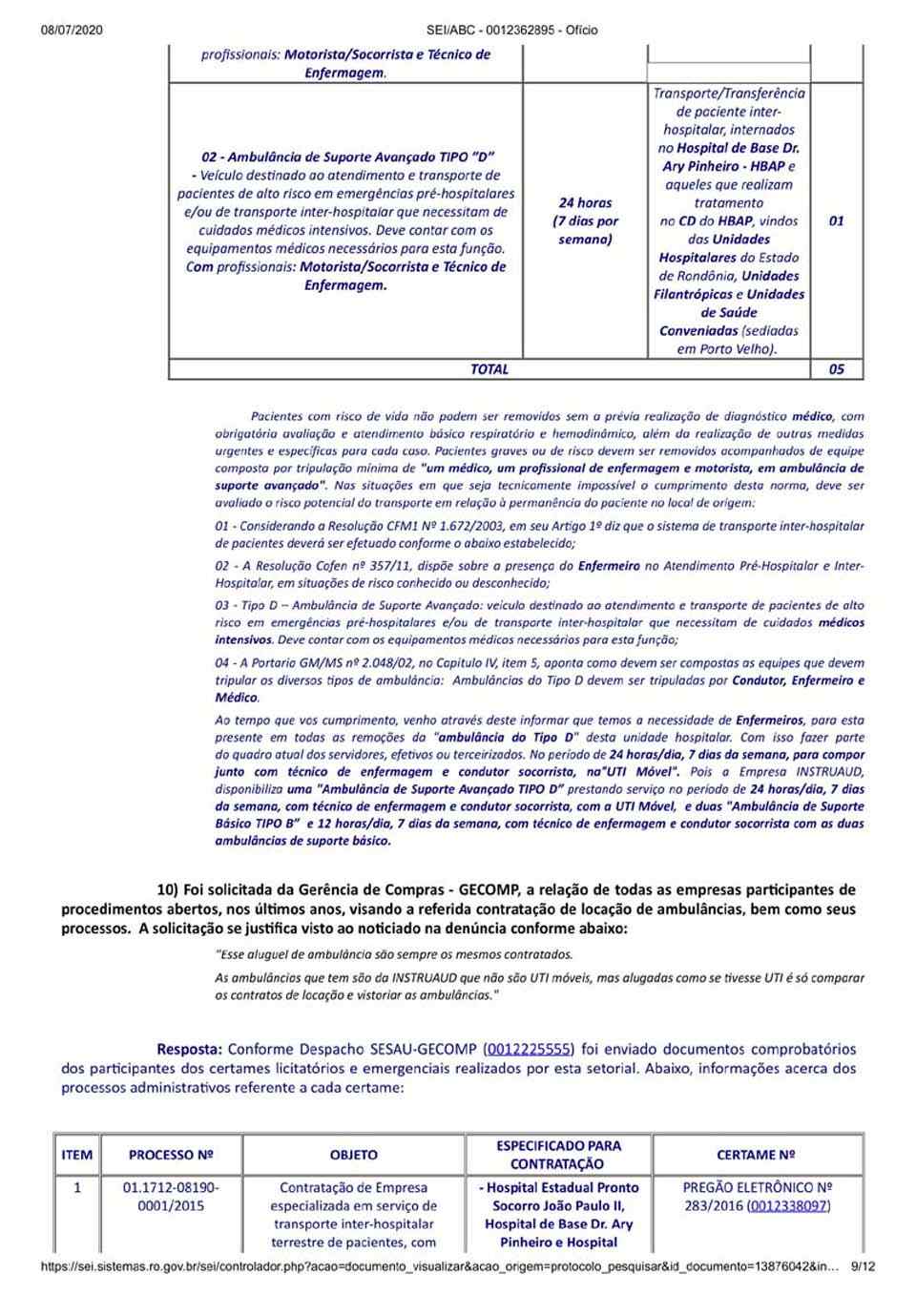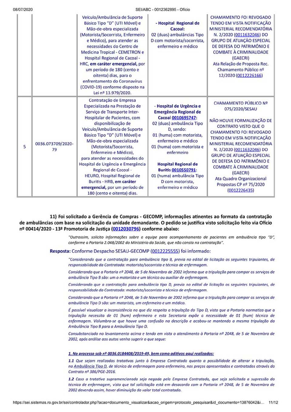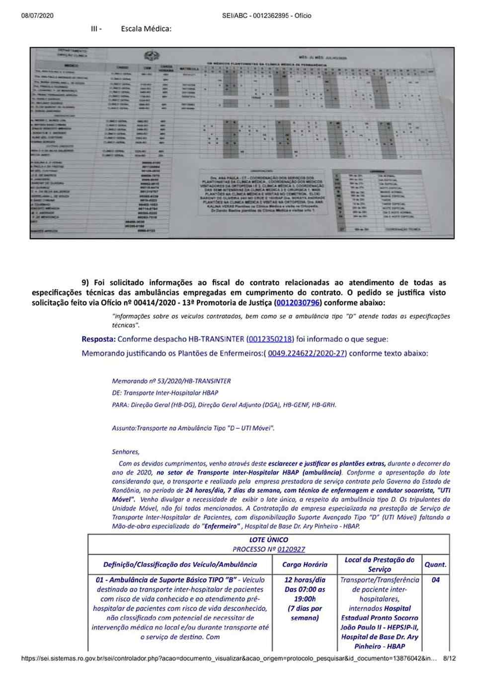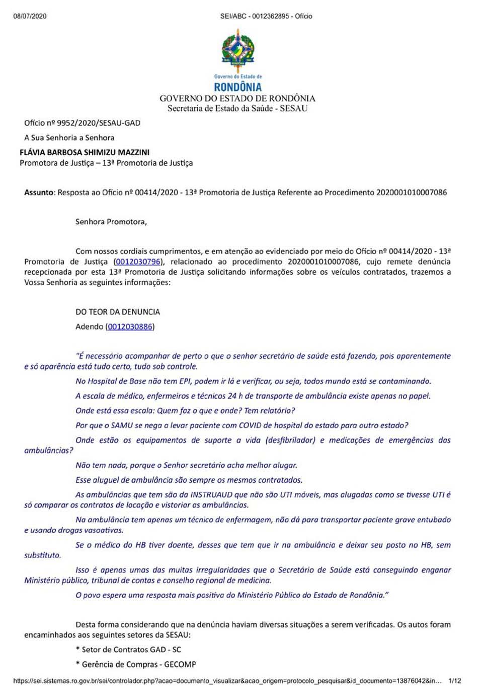 São respostas apresentadas pela Sesau/RO após a promotora Flávia Barbosa Shimizu Mazzini, da 13ª Promotoria de Justiça, encaminhar denúncia recepcionada pelo Ministério Público (MP/RO) referente a ambulâncias e questões voltadas ao Hospital de Base Ary Pinheiro.