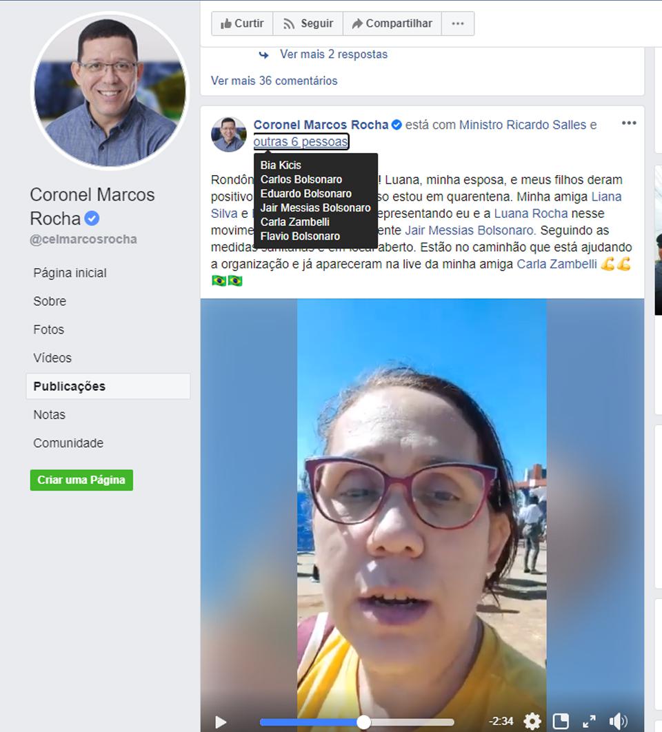 Numa veiculação realizada em sua página oficial no Facebook, o chefe do Executivo marcou personalidades completamente fora do contexto regional. São eles: os três filhos do presidente na política, ou seja, Carlos, Flávio e Eduardo, além do ministro Ricardo Salles, as deputadas federais Bia Kicis e Carla Zambelli, e o próprio presidente da República Jair Bolsonaro.