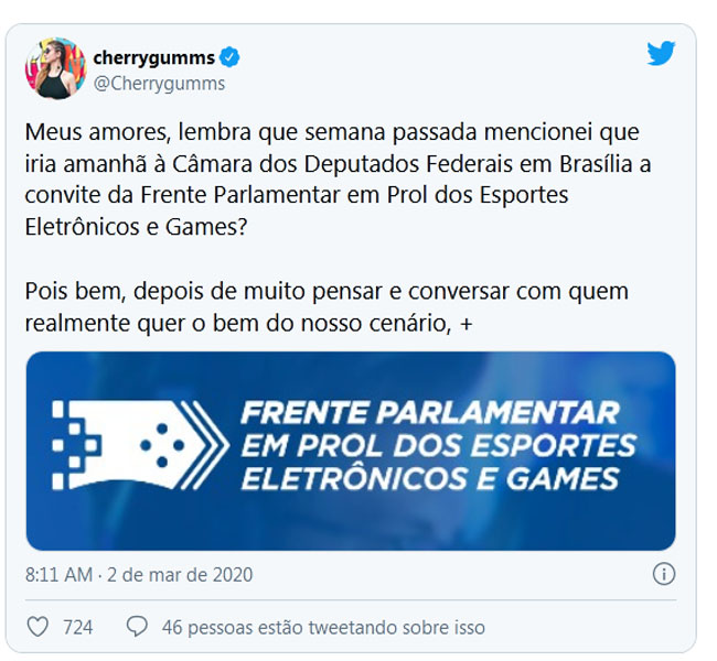 A empresária foi a única do meio a ser convidada para compor a Frente Parlamentar. Segundo Cherrygums, a decisão de não participar do debate foi tomada em conjunto com outras personalidades do esporte eletrônico nacional.