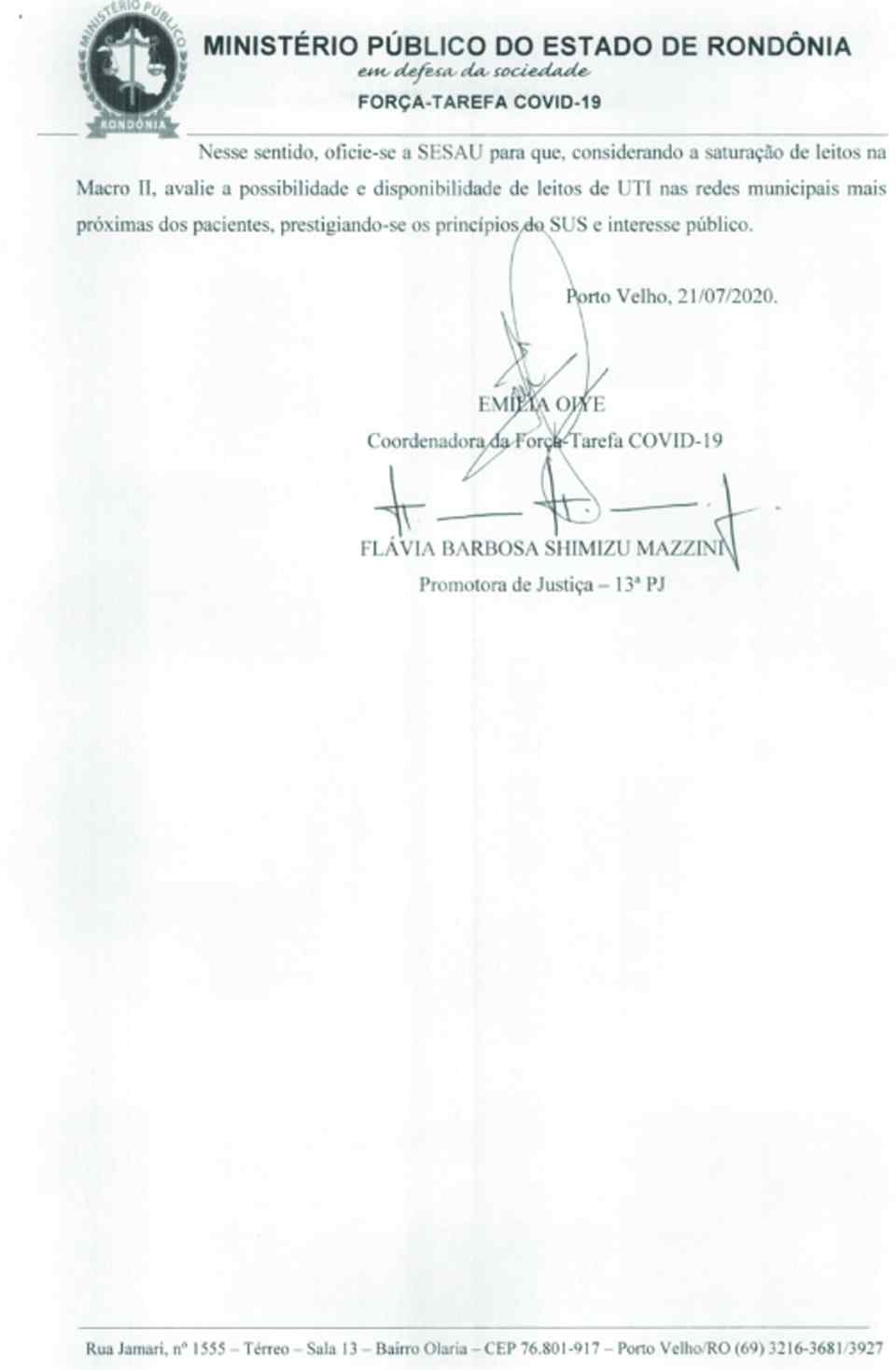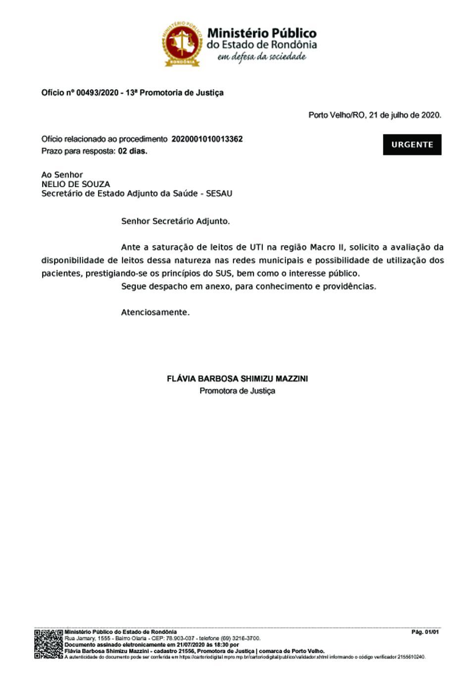 Ofício assinado pela promotora de Justiça Flávia Barbosa Shimizu Mazzini e encaminhado ao secretário-adjunto de Saúde (Sesau/RO) Nélio de Souza com a chancela de urgente fala em “saturação de leitos de UTI”.