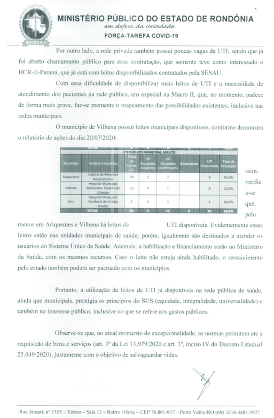 Ao fim, a dupla requisitou ao adjunto da Sesau/RO, que, “considerando a saturação de leitos [...] avalie a possibilidade e disponibilidade de leitos de UTI nas redes municipais mais próximas dos pacientes, prestigiando os princípios do SUS e interesse público”.