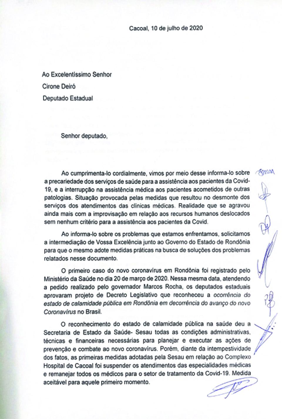 Porto Velho, RO – Uma carta assinada por sete médicos do Hospital de Urgência e Emergência Regional (HEURO) e do Hospital Regional de Cacoal (HRC) fora encaminhada ao deputado Cirone Deiró, representante da região na Assembleia Legislativa (ALE/RO).