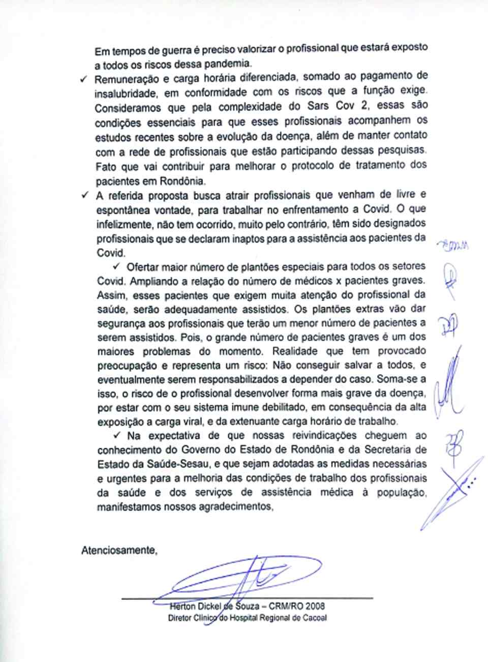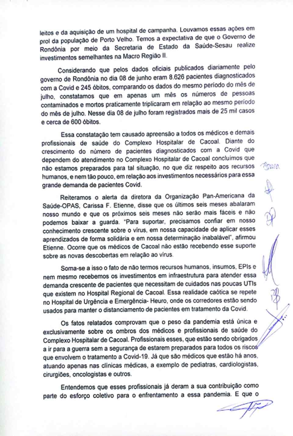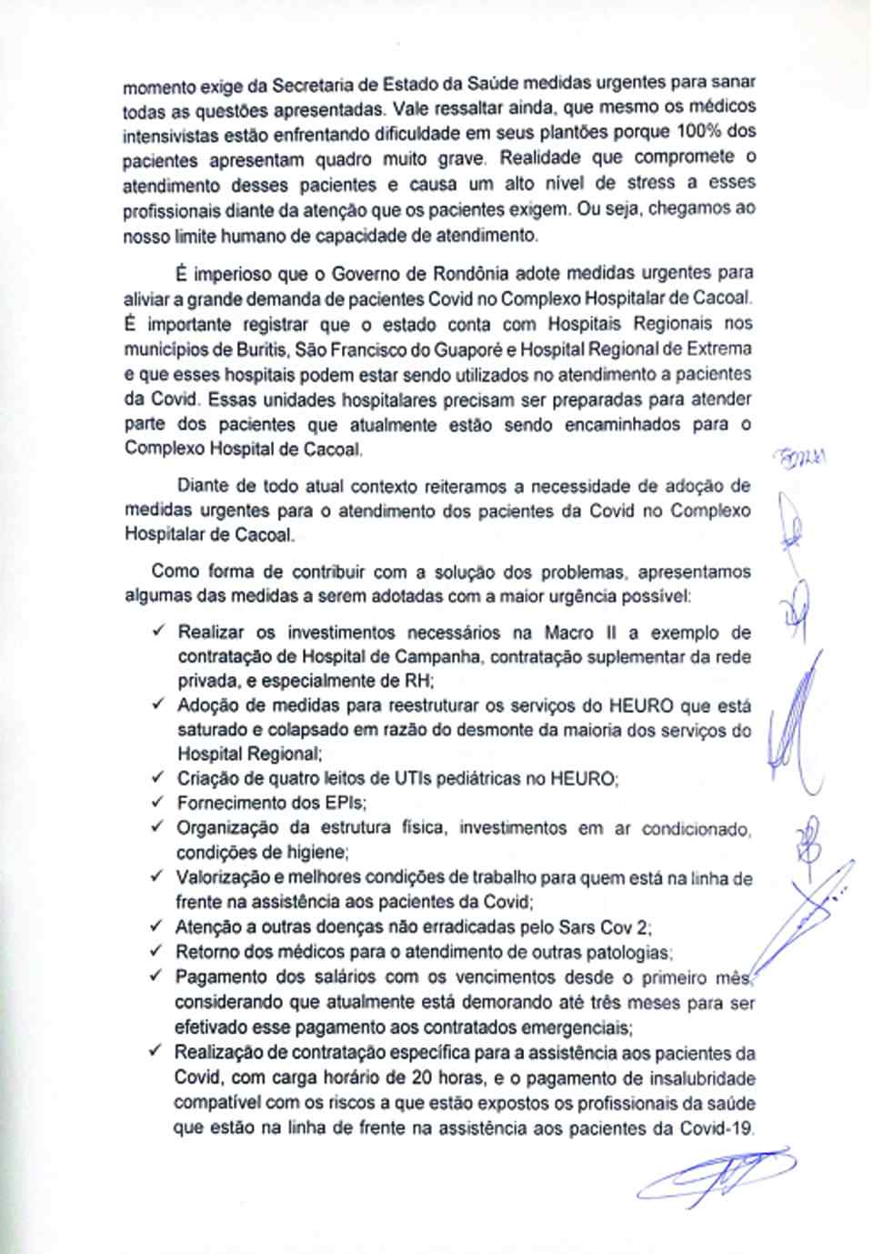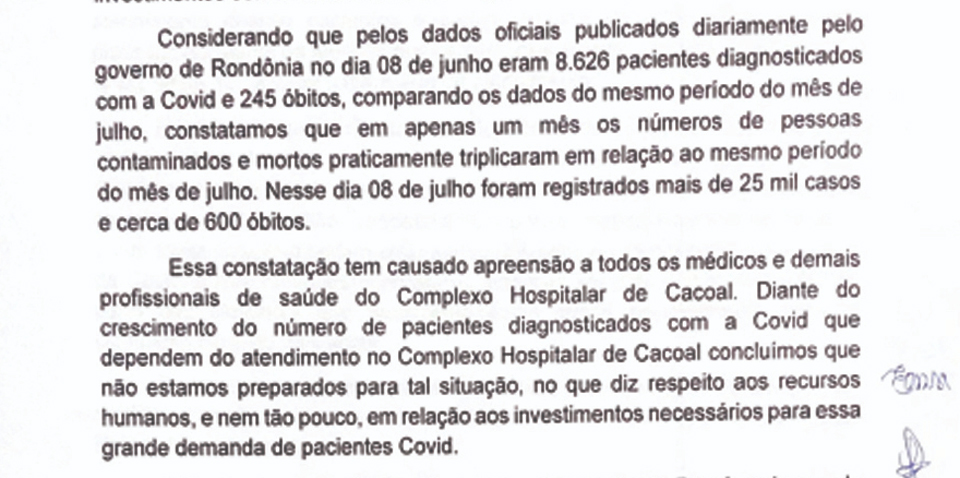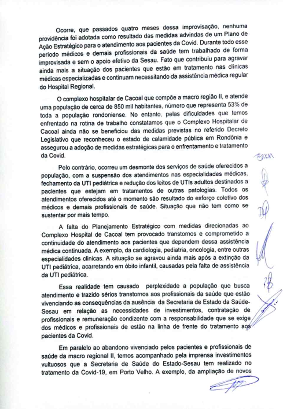 “Durante todo esse período, médicos e demais profissionais da saúde têm trabalhado de forma improvisada e sem apoio afetivo da Sesau/RO. Fato que contribuiu para agravar ainda mais a situação dos pacientes que estão em tratamento nas clínicas médicas especializadas e continuam necessitando da assistência médica regular do Hospital Regional".