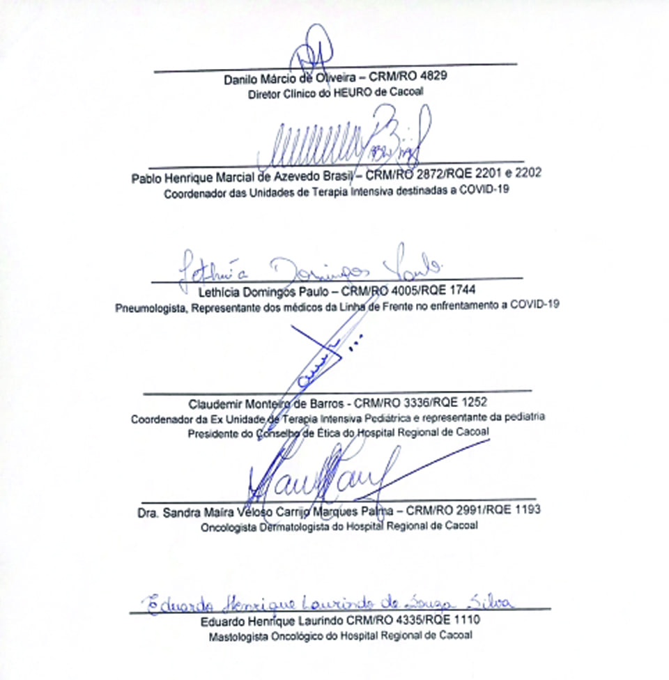 O manifesto é assinado por Herton Dickel de Souza, diretor-clínico do HCR; Danilo Márcio de Oliveira, diretor-clínico do HEURO; e Pablo Henrique Marcial de Azevedo Brasil, coordenador das Unidades de Terapia Intensiva destinada à COVID-19.