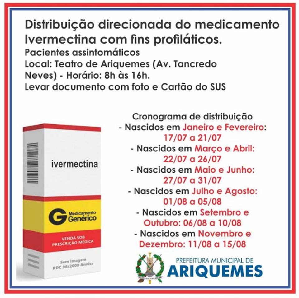A Prefeitura de Ariquemes, por meio da Secretaria Municipal de Saúde (SEMSAU), inicia na próxima sexta-feira (17), a distribuição direcionada do medicamento Ivermectina com fins profiláticos no enfrentamento ao novo coronavírus (Covid-19). O medicamento será destinado aos pacientes assintomáticos.