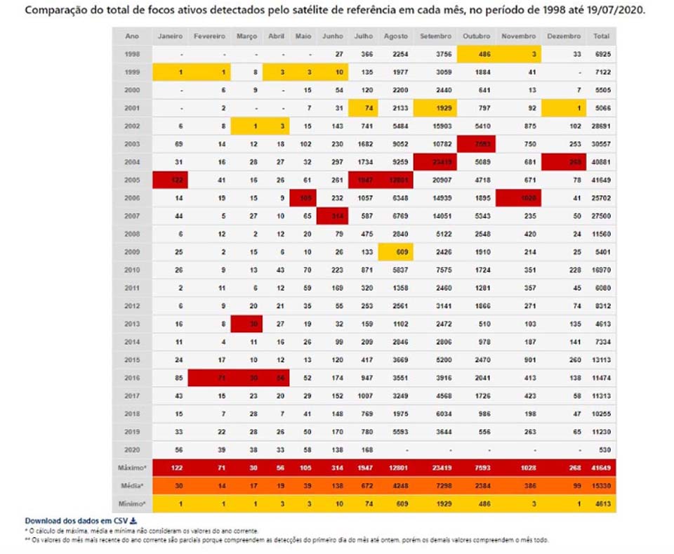 Os últimos dados divulgados pelos satélites do Instituto Nacional de Pesquisas Espaciais (Inpe), apontam uma diminuição dos números de focos de queimadas no período compreendido entre 1º de janeiro a 15 de julho de 2020, se comparado ao mesmo período de 2019. Um foco precisa ter pelo menos 30 metros de extensão por um metro de largura, para que os satélites de órbita possam detectá-lo. No caso dos satélites geoestacionários, a frente de fogo precisa ter o dobro de tamanho para ser localizada.