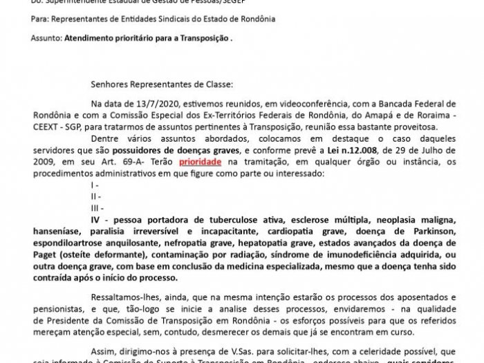 Em reunião com a Bancada Federal de Rondônia, com a Comissão Especial dos Ex-Territórios Federais de Rondônia, Amapá e de Roraima (CEEXT) e com o Sintero, bem como os demais representantes sindicais dos Estados, a Superintendência Estadual de Gestão de Pessoas (Segep) discutiu sobre os processos da Transposição, dando destaque ao pedido de celeridade na análise dos processos dos servidores portadores de doenças graves e que estão aptos para transpor, ou seja, aqueles beneficiados com a Lei 11.681/2018, que concede o direito aos contratados até 15 de março de 1987 . Na oportunidade, ficou acordado que o Estado encaminhará à Brasília, uma lista com o nome e a documentação dos servidores que possuem direito à tal prioridade.