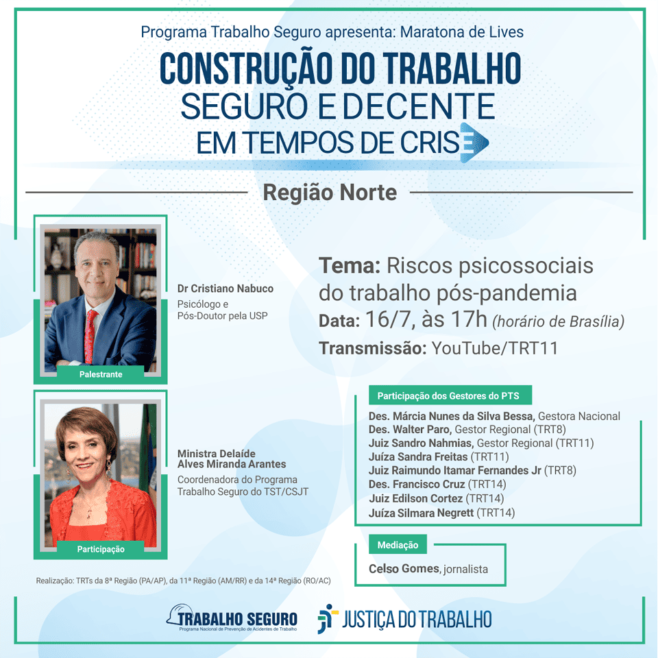 A Live com os TRTs da 8ª, da 11ª e da 14ª regiões, que têm jurisdição nos estados do Pará, Amapá, Amazonas, Roraima, Rondônia e Acre, respectivamente, será no dia 16 de julho, às 17h, horário de Brasília, com Transmissão pelo canal do TRT 11 (AM/RR) no YouTube. Para falar sobre o tema "Riscos Psicossociais do Trabalho pós-pandemia" foi convidado o psicólogo Cristiano Nabuco, que tem doutorado em Psicologia Clínica pela Universidade do Minho (Portugal) e pós-doutorado pelo Departamento de Psiquiatria do Hospital das Clínicas da Faculdade de Medicina da Universidade de São Paulo (USP).