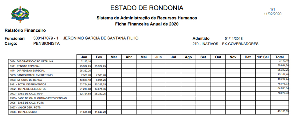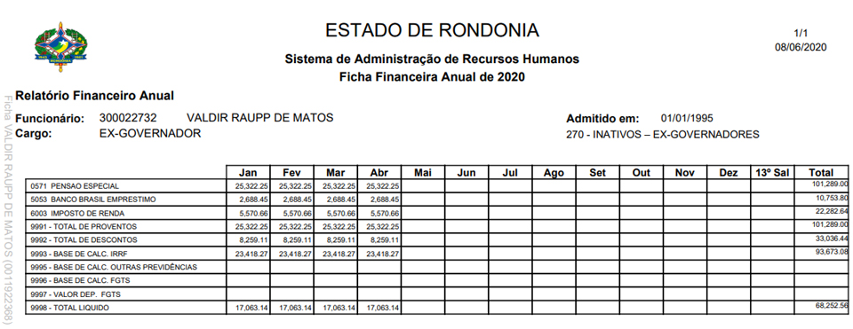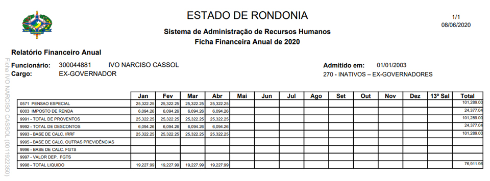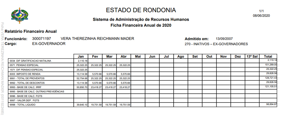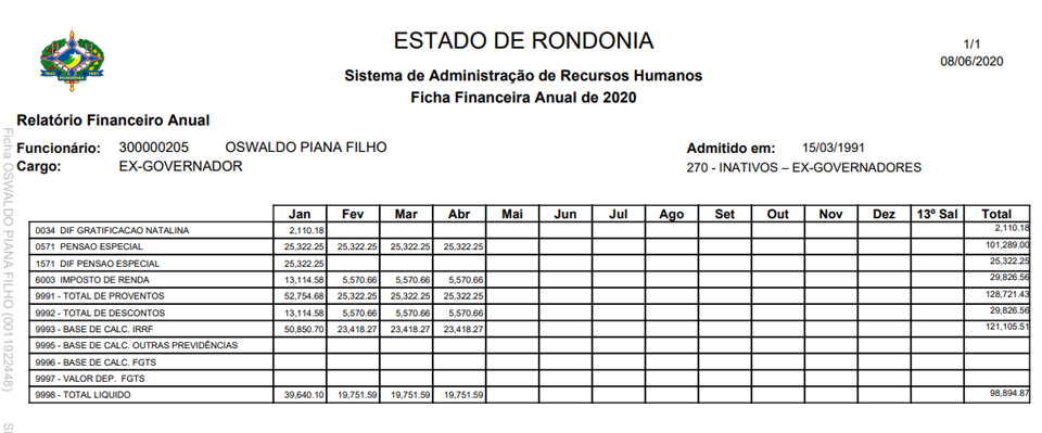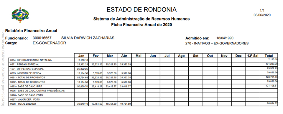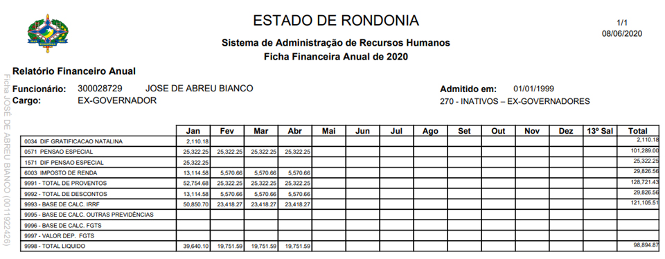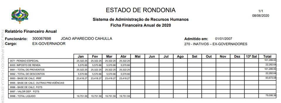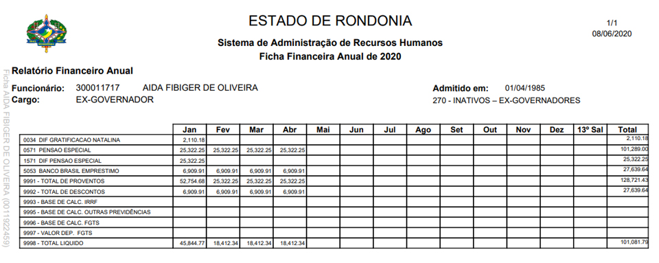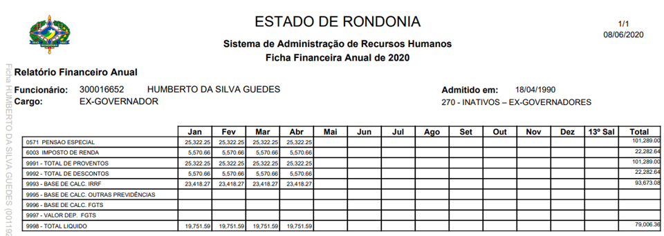 No quadrimestre apontado, cada um deles recebeu R$ 101.289,00; isto significa que em períodos de 30 dias, o Estado de Rondônia concedeu R$ 25.322,25 à cada nome listado valor que acompanha o salário do atual governador Coronel Marcos Rocha (sem partido).