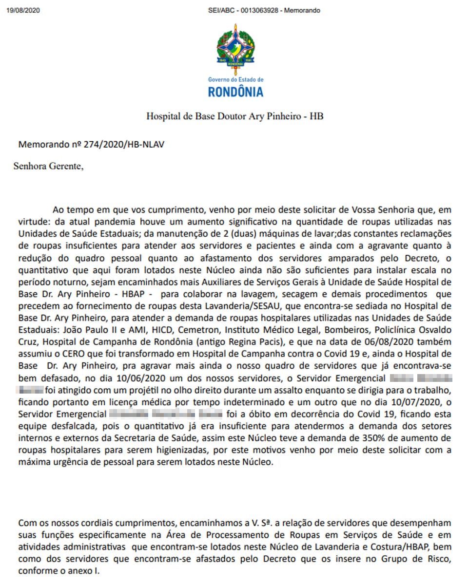 Porto Velho, RO – Um pedido de socorro institucional. É assim que se interpreta documento obtido exclusivamente pelo jornal eletrônico Rondônia Dinâmica, onde o setor de Lavanderia da Secretaria de Saúde (Sesau/RO) fala sobre o aumento de 350% na demanda após a deflagração da pandemia do novo Coronavírus (COVID-19/SARS-CoV-2).
