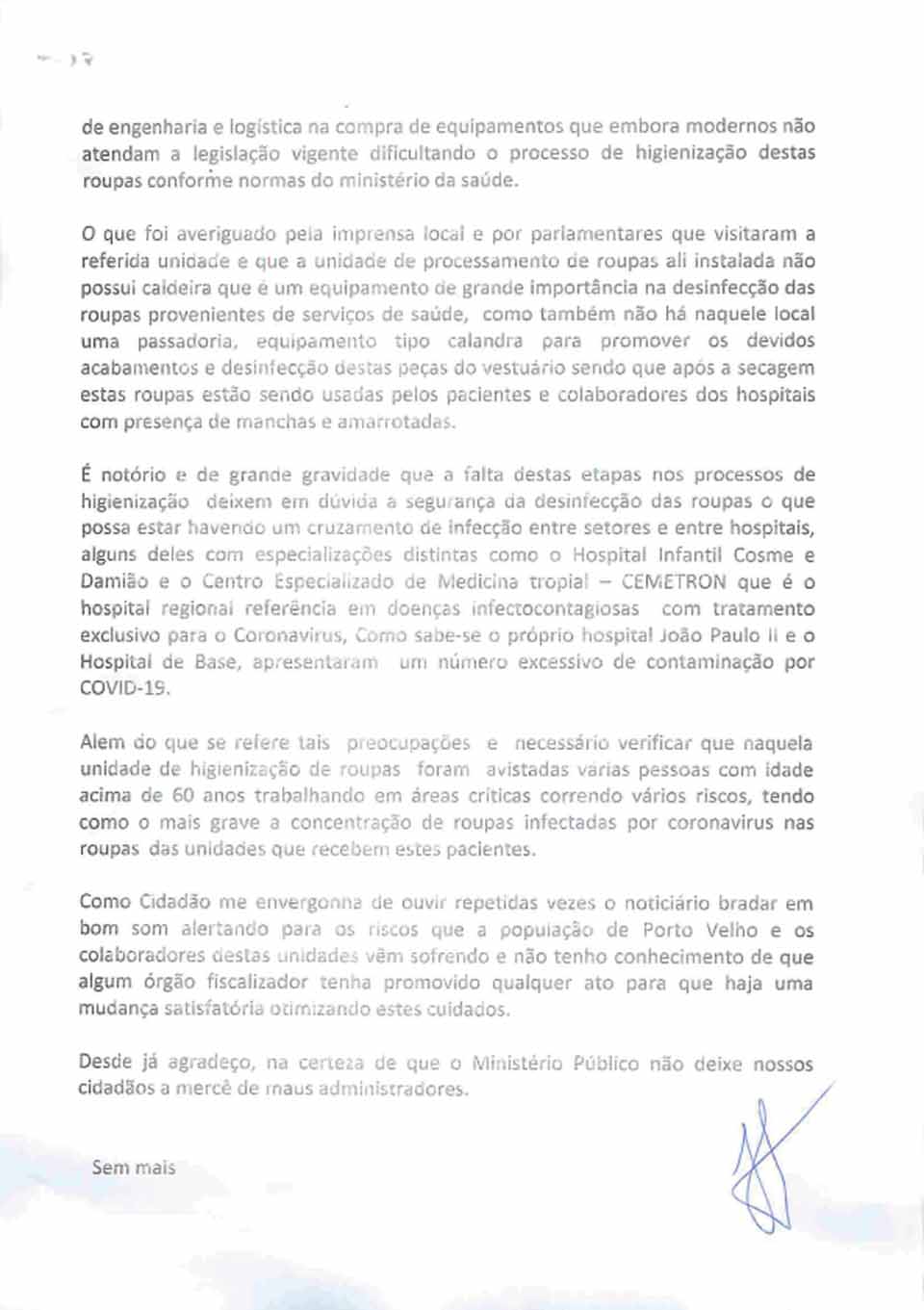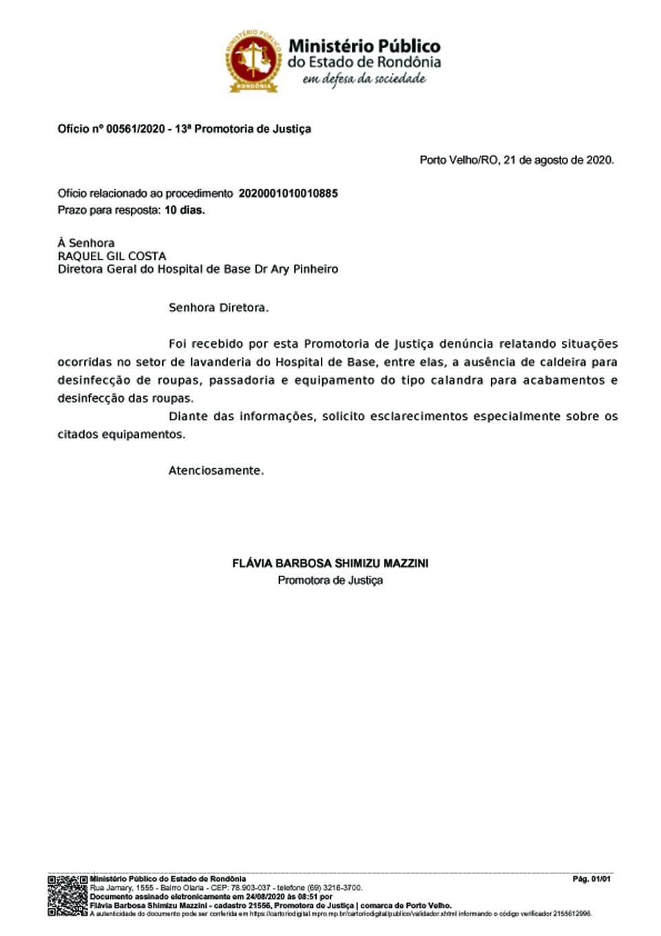 A promotora de Justiça Flávia Barbosa Shimizu Mazzini pediu esclarecimentos à diretora-geral da unidade, Raquel Gil Costa, sobre “situações ocorridas no setor de lavanderia do Hospital de Base, entre elas, a ausência de caldeira para desinfecção de roupas, passadoria e equipamento do tipo calandra para acabamentos e desinfecção das roupas”.