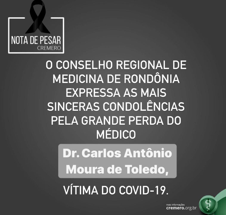 O Conselho Regional de Medicina de Rondônia expressa as mais sinceras condolências pela grande perda do médico Dr. Carlos Antonio Moura de Toledo, vítima do Covid-19.