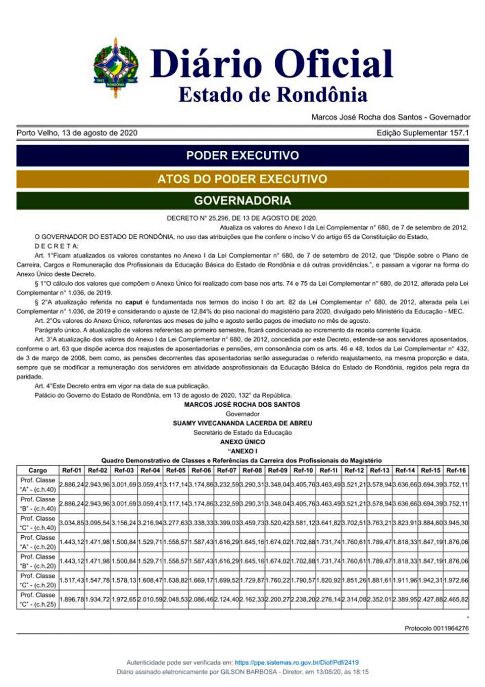 Em um marco histórico para o Sintero e para os trabalhadores em educação, a reivindicação da categoria, para que o Piso do Magistério fosse concedido de forma automática aos servidores inativos, assim que os servidores da ativa fossem beneficiados, foi finalmente atendida. A medida foi assegurada através do Decreto nº 25.296, de 13 de agosto de 2020, em que o Governo do Estado demonstra, pela primeira vez, estar alinhado com o Instituto de Previdência dos servidores Públicos do Estado de Rondônia (IPERON), ao normatizar e assegurar o pagamento do Piso de 2020, que foi de 12,84%, aos aposentados.