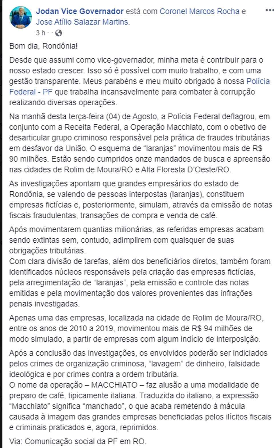 Porto Velho, RO – No Facebook, além de reproduzir um vídeo do ano passado e transcrever quase que integralmente matéria institucional encaminhada pela Polícia Federal (PF) aos órgãos de Imprensa, o vice-governador elogiou a incursão do órgão.