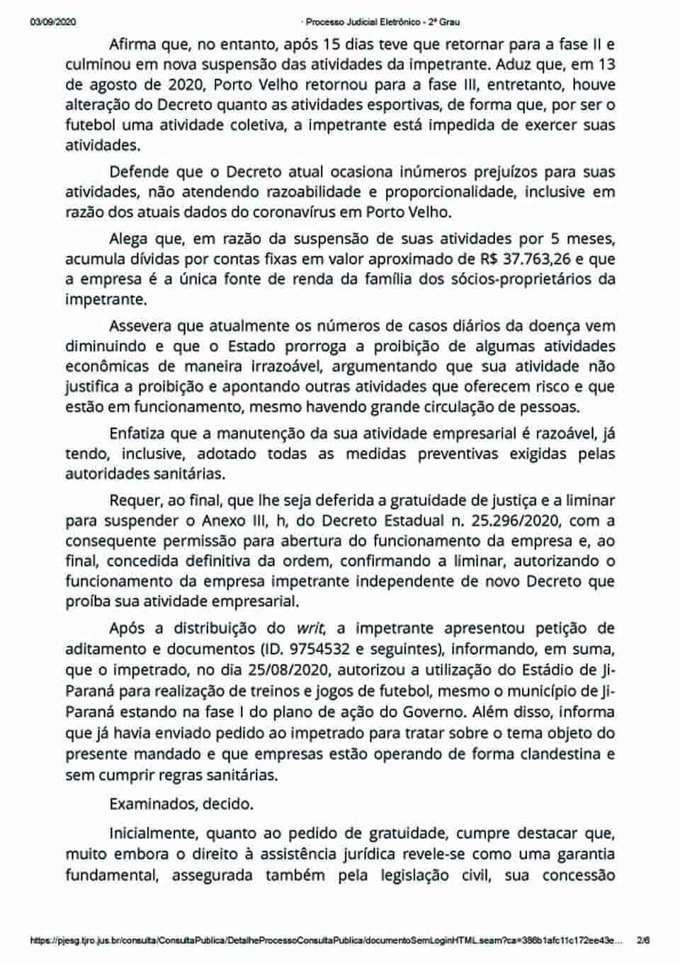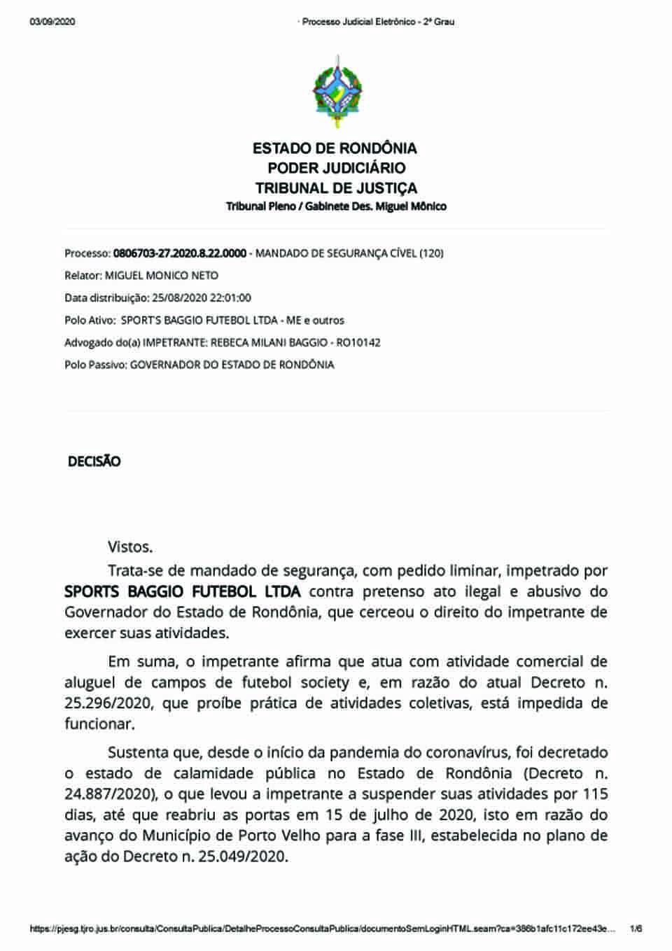 Porto Velho, RO – A empresa Sports Baggio Futebol Ltda, situada na Capital, procurou a Justiça de Rondônia a fim de tentar liberar suas atividades de ordem econômica, limitadas em decorrência do Decreto de Calamidade Pública editado e publicado pelo governador Coronel Marcos Rocha, sem partido.