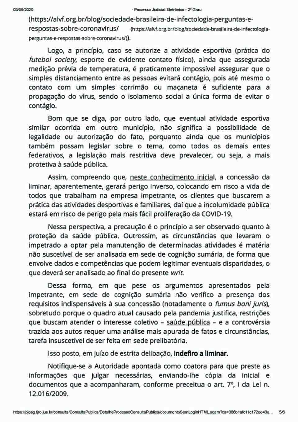 “Logo, a princípio, caso se autorize a atividade esportiva (prática do futebol society, esporte de evidente contato físico), ainda que assegurada medição prévia de temperatura, é praticamente impossível assegurar que o simples distanciamento entre as pessoas evitará contágio, pois até mesmo o contato com um simples corrimão ou maçaneta é suficiente para a propagação do vírus, sendo o isolamento social a única forma de evitar o contágio”, sacramentou.