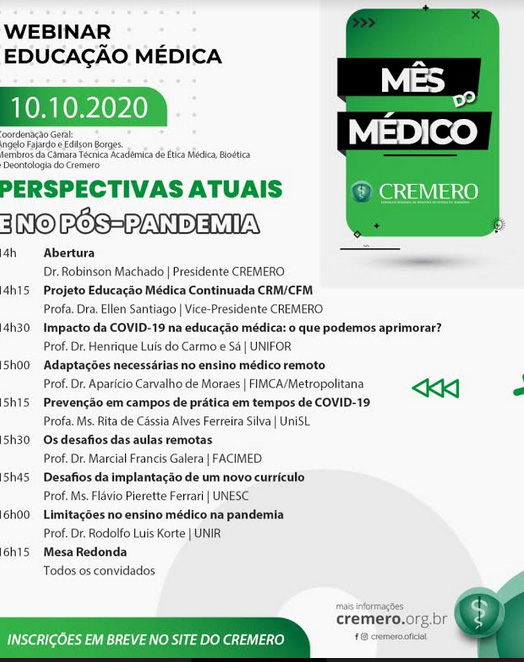 A programação inicia com a exposição fotográfica “Transformando Olhares” de André François que estará na sede do Cremero durante todo o mês para os visitantes. Também na mesma quinta-feira (01) iniciará o cronograma do Mês Científico com palestras agendadas para todas as quintas-feiras do mês que serão transmitidas por videoconferência com a participação de médicos renomados de todo Brasil. “Somado às quintas-feiras científicas, no dia 10 teremos o Webinar Educação Médica promovido pelos alunos da UNIR e Membros da Câmara Técnica Acadêmica de Ética Médica, Bioética e Deontologia do Cremero, Ângelo Fajardo e Edilson Borges com o tema ‘Perspectivas atuais e no pós-pandemia’. Serão momentos únicos para compartilhar conhecimento tanto entre acadêmicos da área da saúde em geral quanto médicos. As inscrições serão abertas em breve e divulgadas pelas mídias sociais e site www.cremero.org.br. Acompanhem”, destacou a coordenadora geral do Mês Científico, Dra. Hévila Rolim.