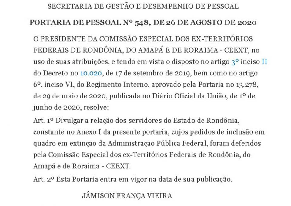 O Diário Oficial da União divulgou a Portaria nº 548, beneficiando 18 servidores de Rondônia com a Transposição. Esses servidores passarão a receber pela folha federal, após enquadramento.