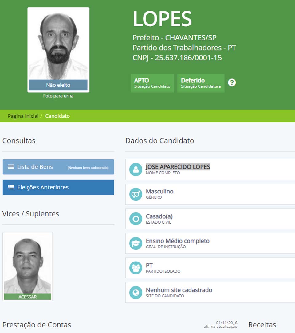 José Aparecido Lopes, o Lopes, e Claudomiro Rodrigues, conhecido como Mirão, concorreram à Prefeitura de Chavantes, no interior de São Paulo, em chapa puro-sangue formalizada pelo PT.