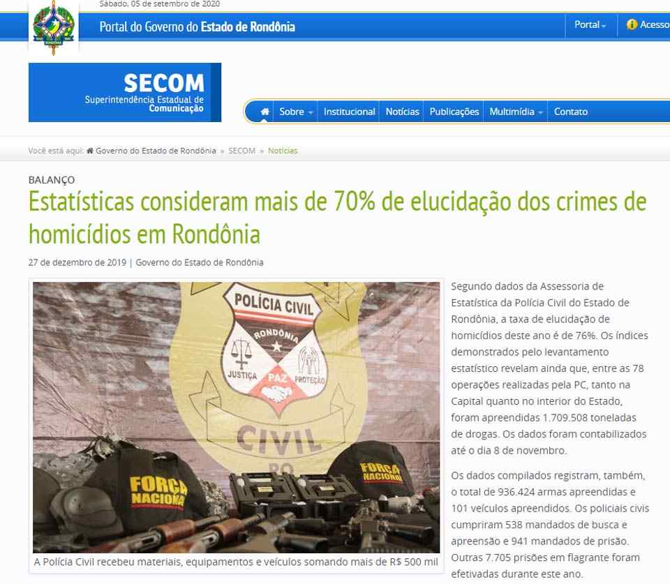 Logo, não há motivos para duvidar de seu empenho. Muito pelo contrário. A PC/RO, para se ter ideia, resolveu, em 2019, 76% dos homicídios sob sua alçada investigativa, índice bem acima da média nacional. Levando em conta as informações veiculadas pela Super Interessante em 2018, um ano antes, “Conforme dados oficiais da Estratégia Nacional de Justiça e Segurança Pública, somente 6% dos homicídios dolosos (com intenção de matar) são solucionados no país”.
