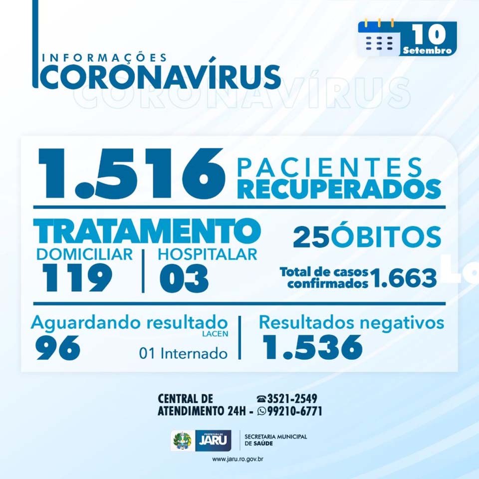 Até o momento foram registrados 1.663 casos da Covid-19 no município, com 1.516 pacientes recuperados. A Prefeitura também informou que atualmente 119 pacientes encontram-se em tratamento domiciliar e 03, Hospitalar.